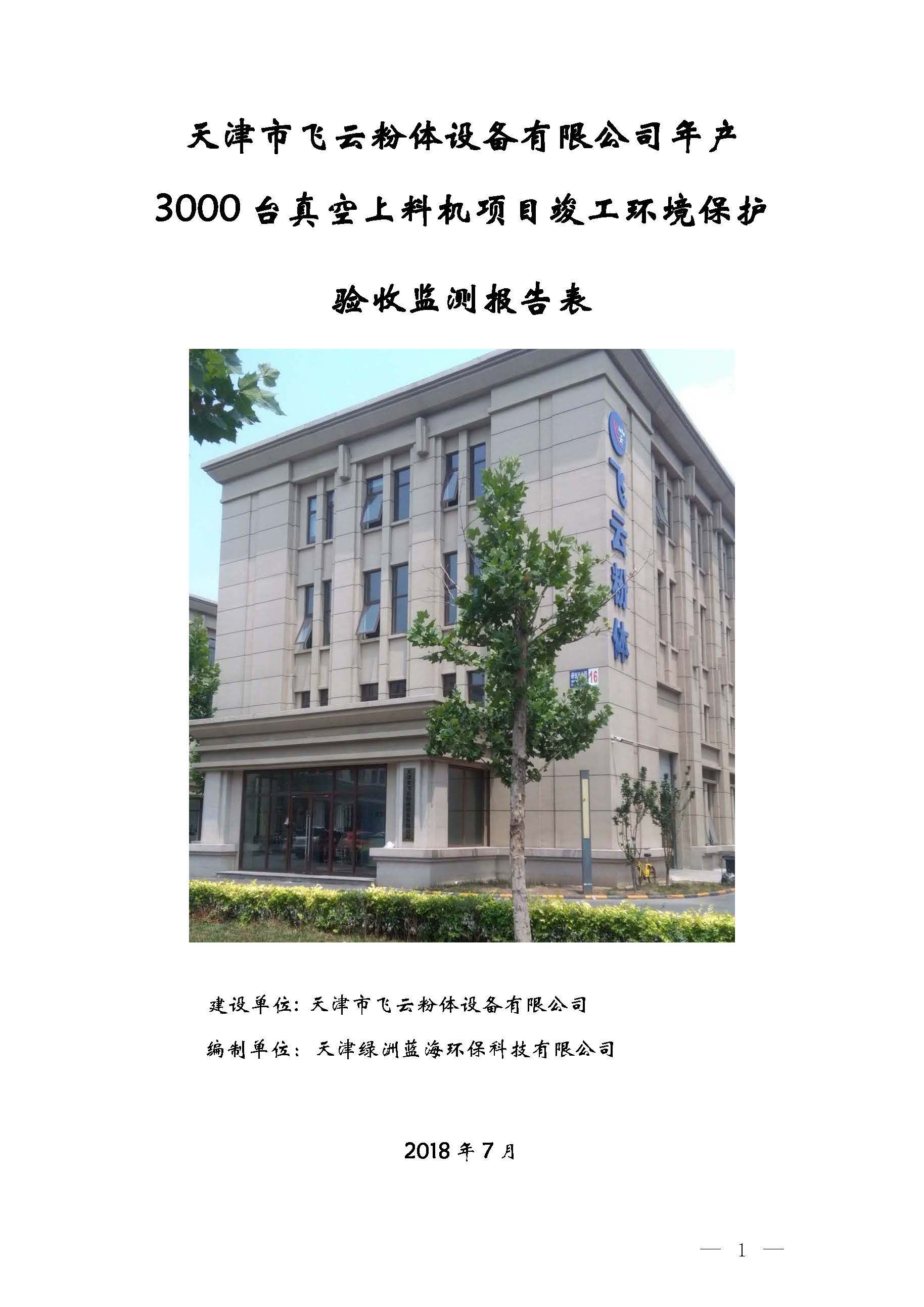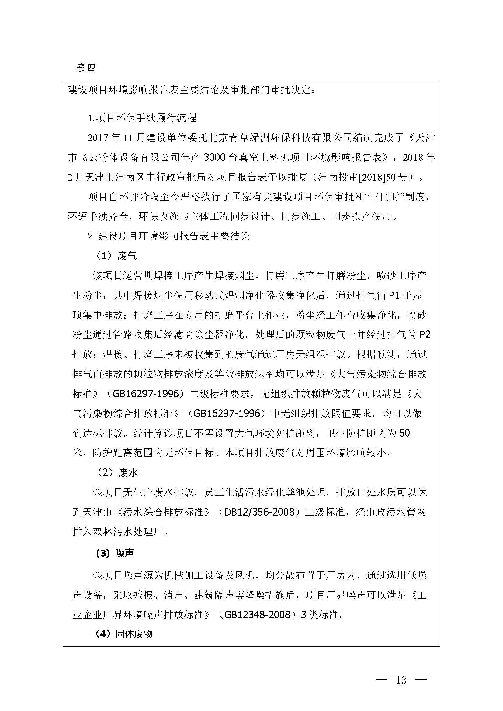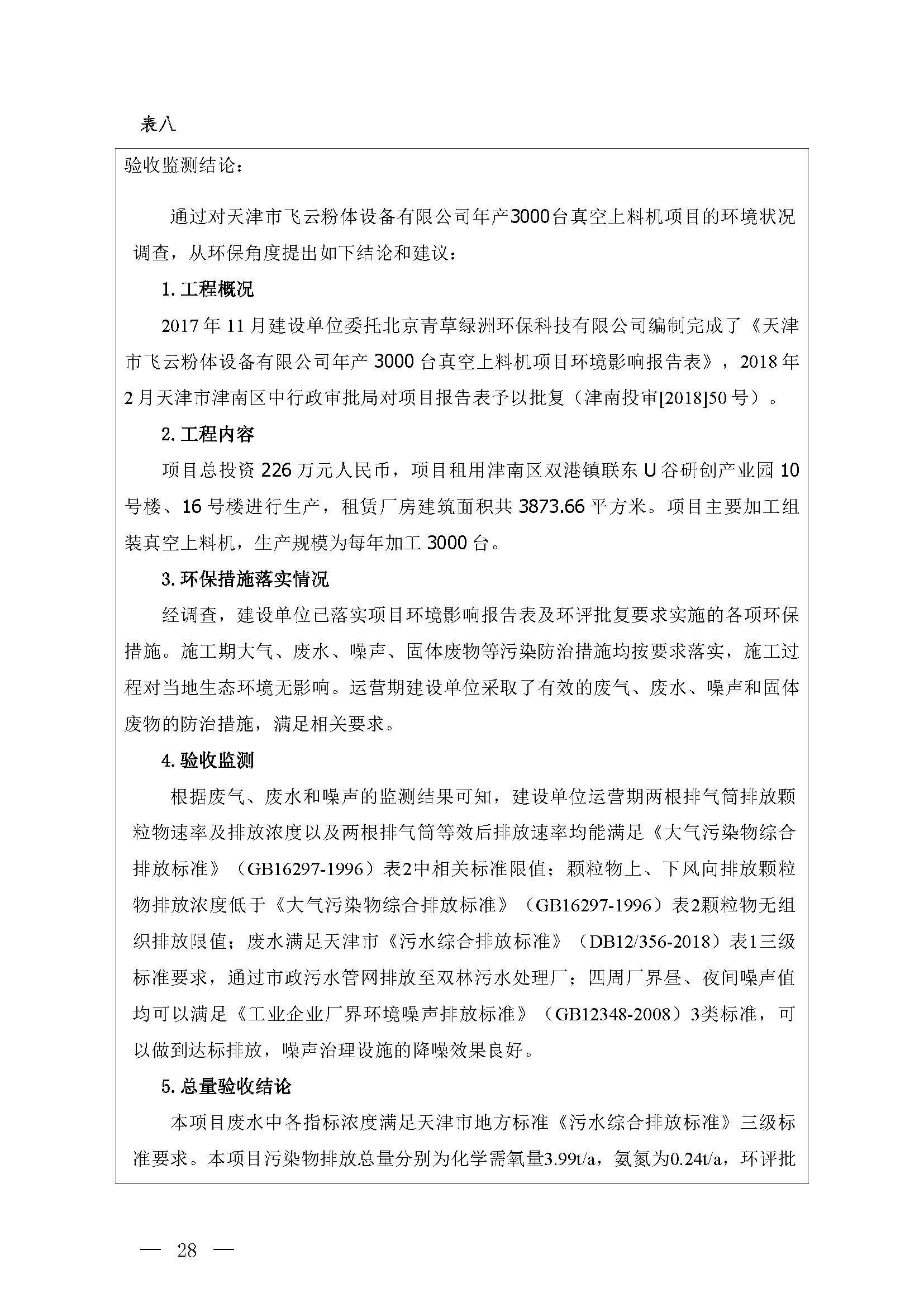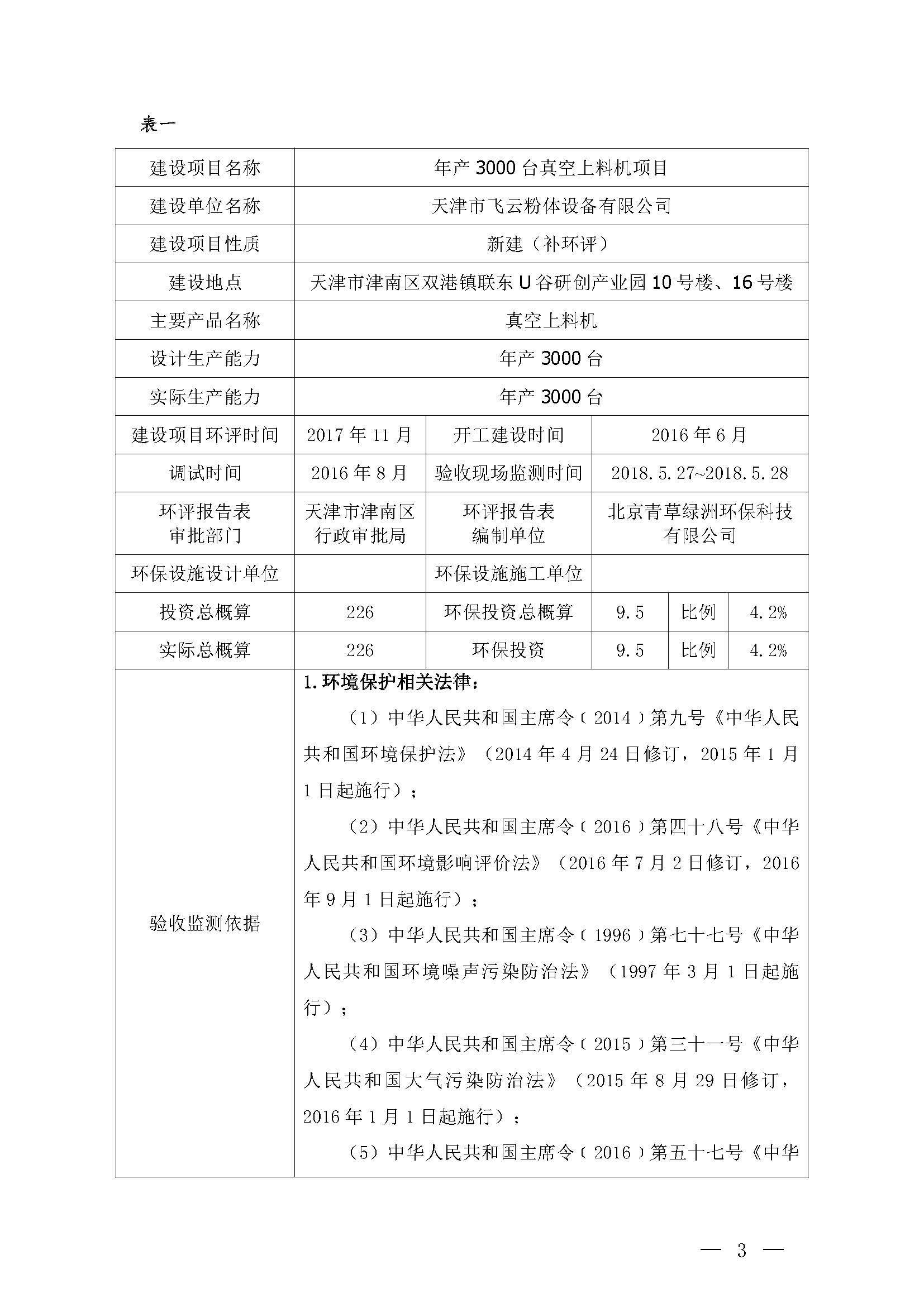 天津市飛云粉體設(shè)備有限公司年產(chǎn) 3000 臺真空上料機(jī)項目竣工環(huán)境保護(hù) 驗收監(jiān)測報告表