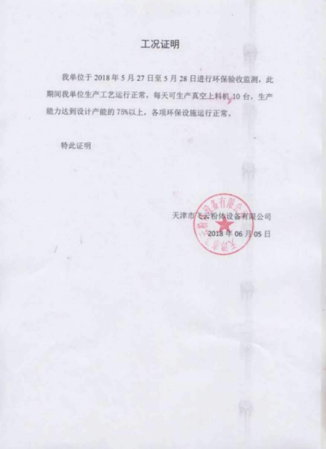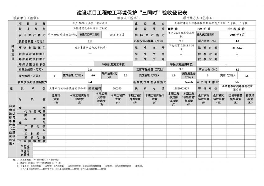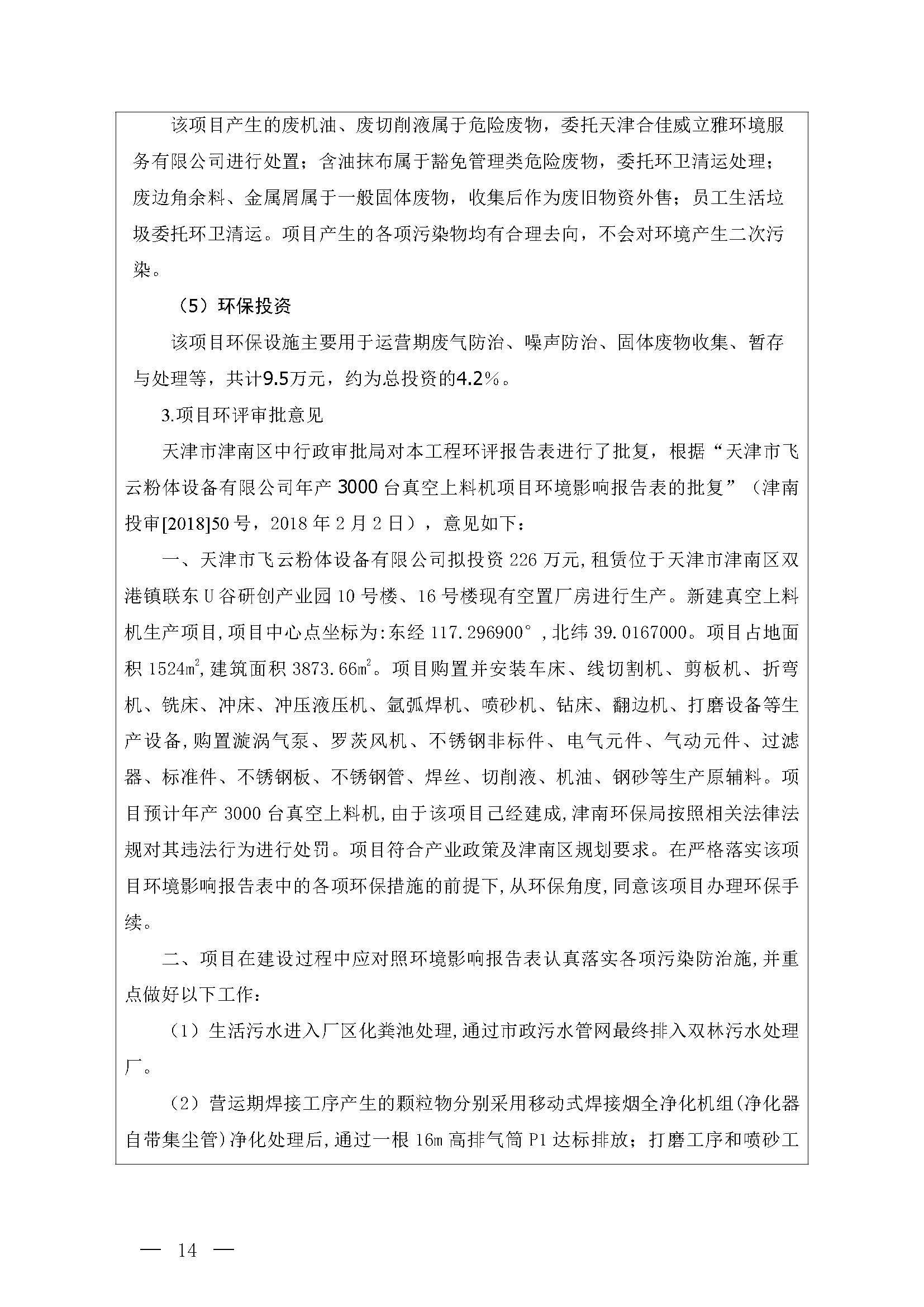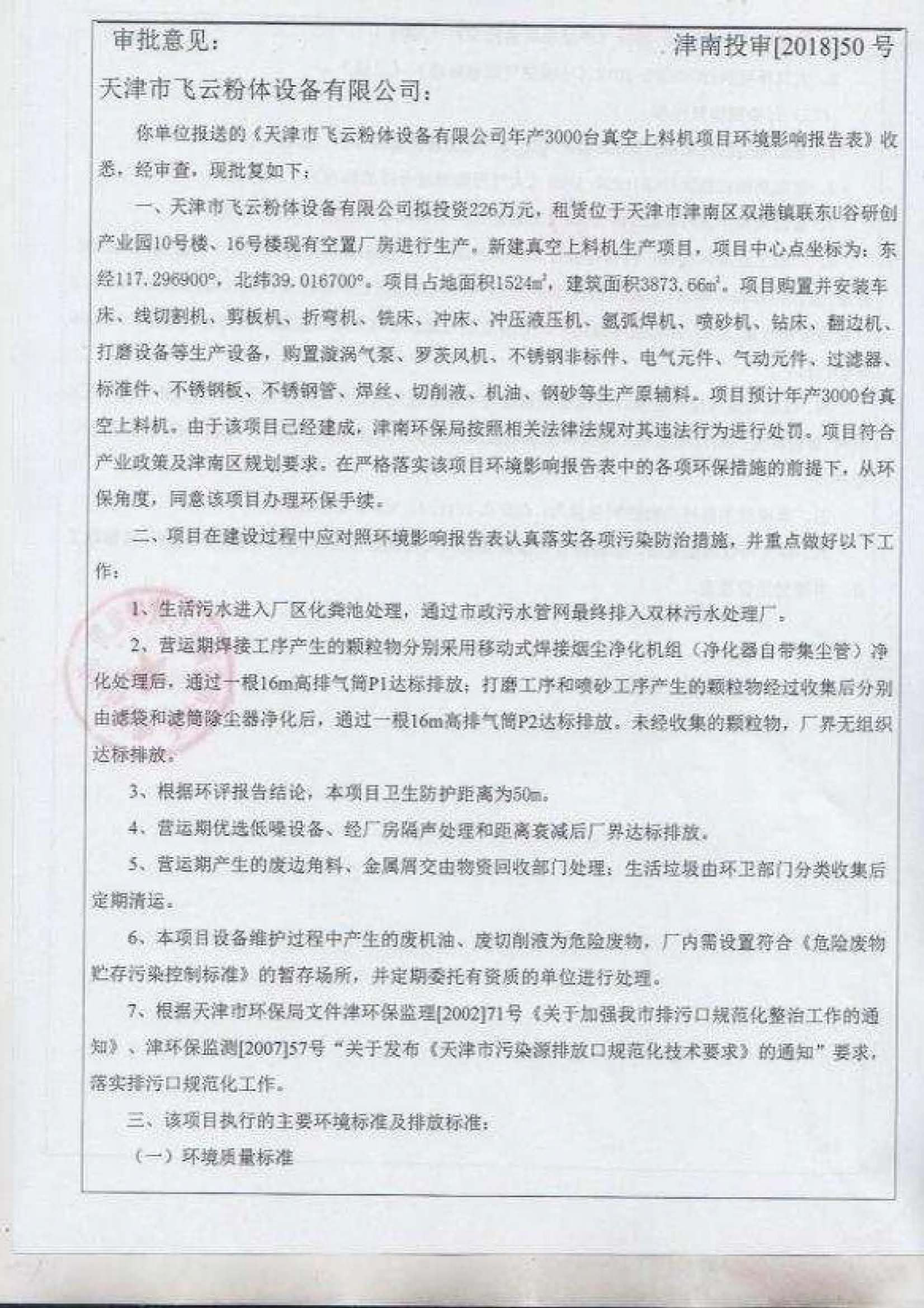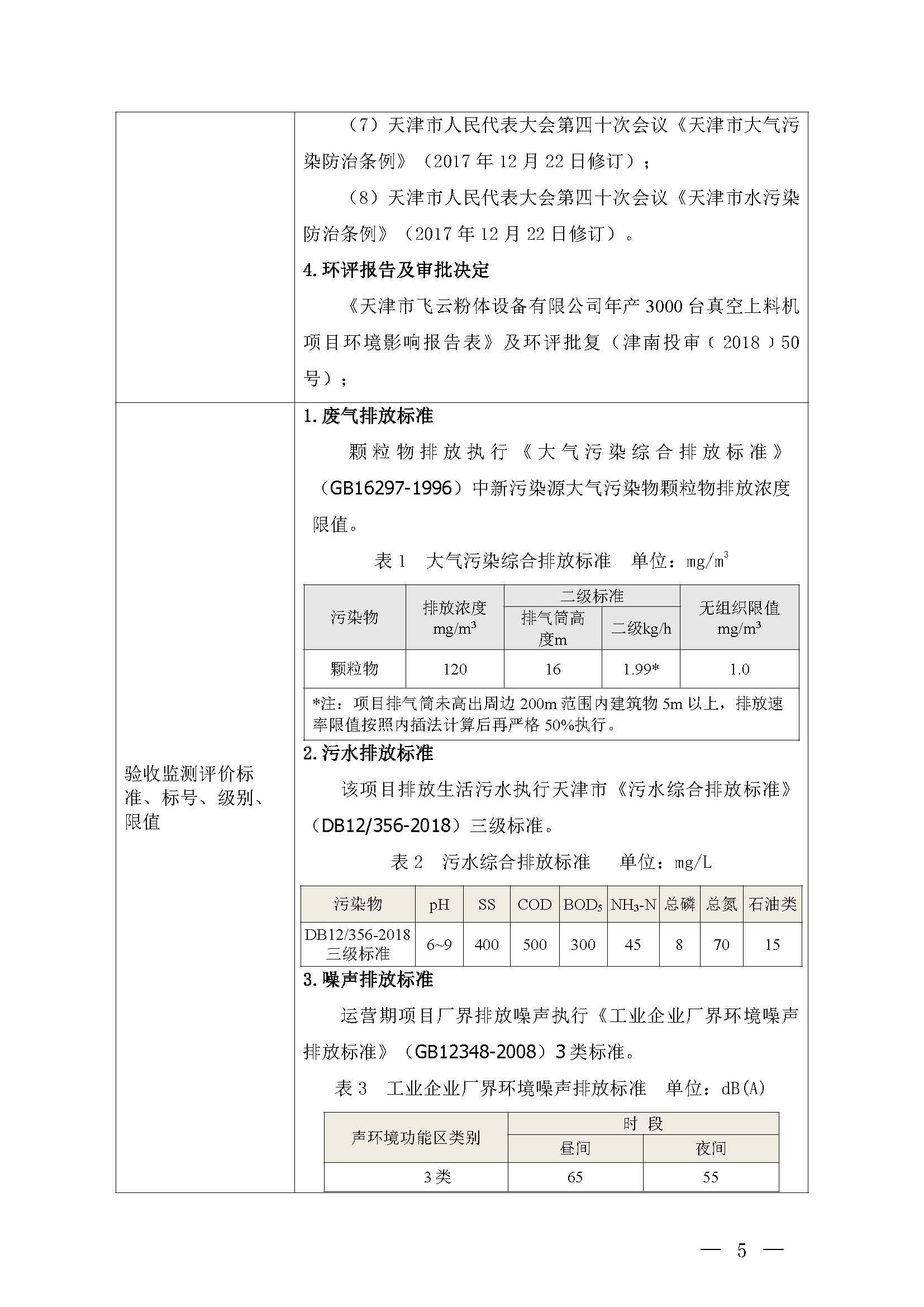 天津市飛云粉體設(shè)備有限公司年產(chǎn) 3000 臺真空上料機(jī)項目竣工環(huán)境保護(hù) 驗收監(jiān)測報告表