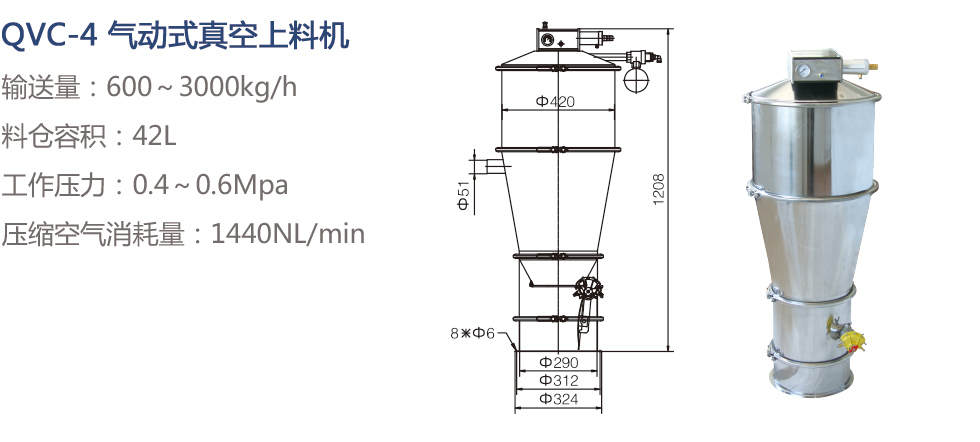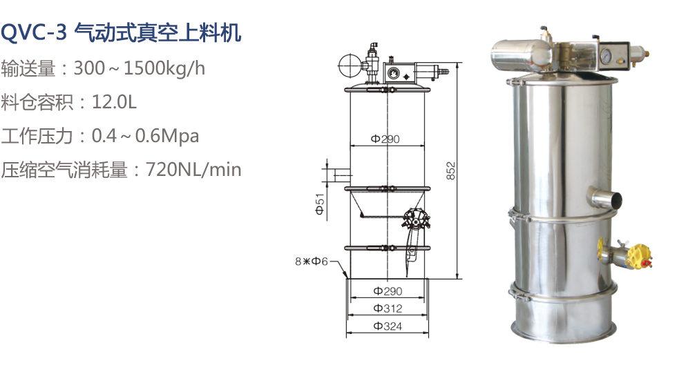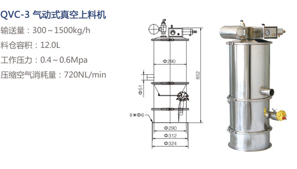 氣動(dòng)式真空上料機(jī)是利用壓縮空氣通過真空發(fā)生器產(chǎn)生高真空實(shí)現(xiàn)對(duì)物料的輸送,不需要機(jī)械式真空泵,具有結(jié)構(gòu)簡單、體積小、免維修、噪音低、控制方便、消除物料靜電和符合GMP要求等優(yōu)點(diǎn)。真空發(fā)生器產(chǎn)生的高真空,使被輸送的物料杜絕了分層現(xiàn)象,保證了混合物料成份的均一性,是壓片機(jī)、膠囊填充機(jī)、干法制粒機(jī)、包裝機(jī)、粉碎機(jī)、振動(dòng)篩等機(jī)械自動(dòng)上料的設(shè)備。