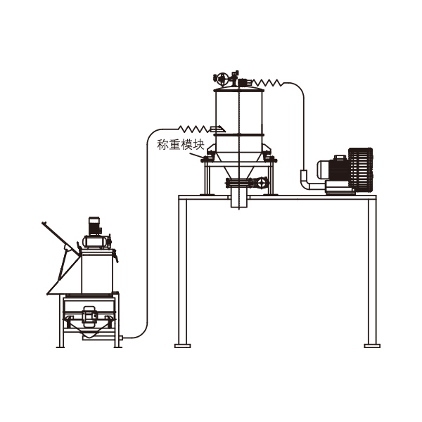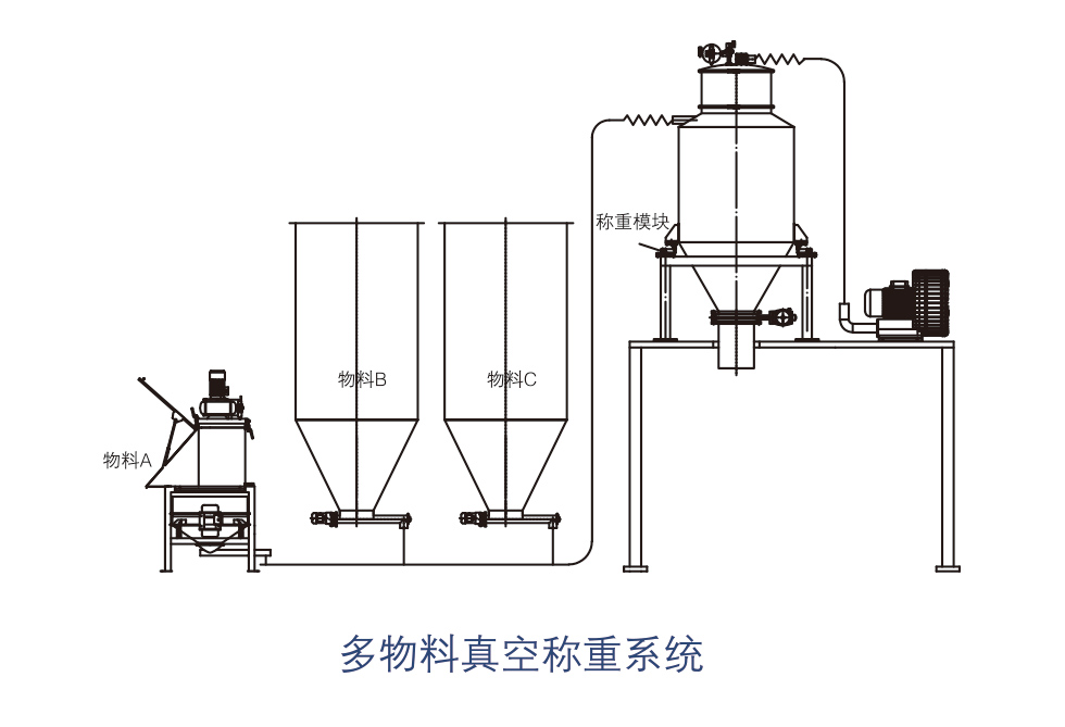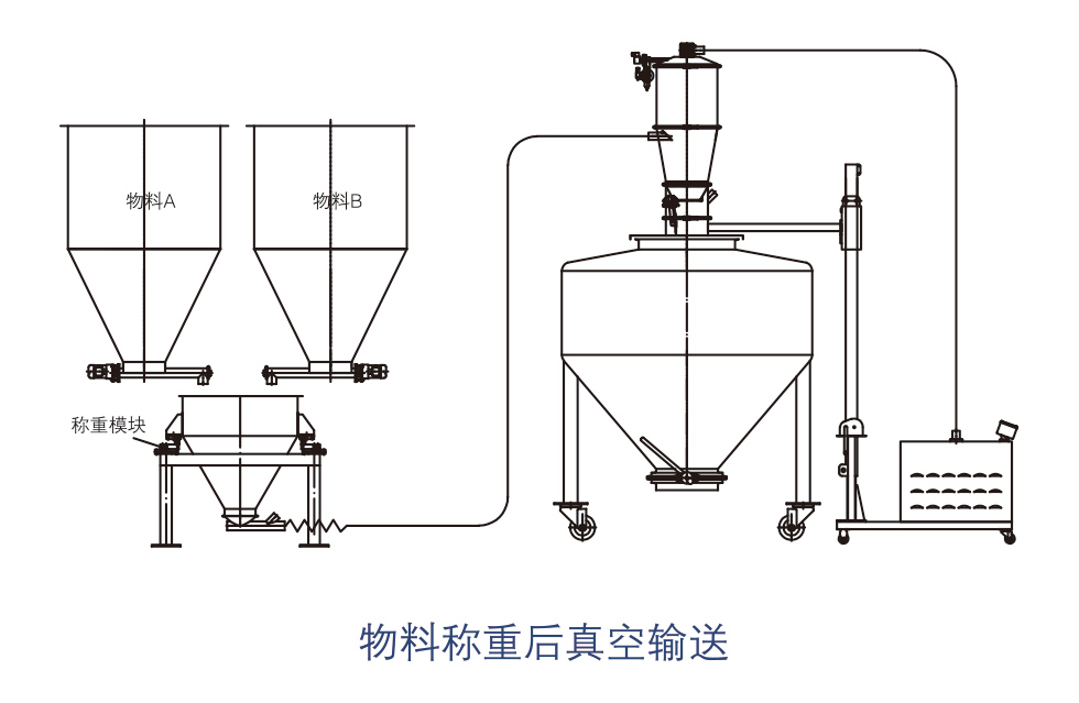 以粉體真空稱重系統應用于兩種物料自動稱重配料為例說明粉體真空承重系統的工作原理。物料A、B分別儲存在兩個料倉中,粉體真空稱重系統開始工作,真空泵啟動,物料A粉倉底部螺旋放料閥A達到一定重量時,螺旋停止,放料閥A關閉,剩余在輸送管中的物料繼續被吸入到稱重料斗中,吸凈后秤中物料A的重量正好是設定的重量。此時,物料B料倉底部螺旋放料閥B打開,螺旋啟動,物料B被吸入稱重料斗中,秤中物料B達到一定重量時,螺旋停止,放料閥B關閉,剩余在輸送管中的物料繼續被吸入到稱重料斗中,吸凈后秤中物料B的重量正好是設定的重量。真空泵停止。